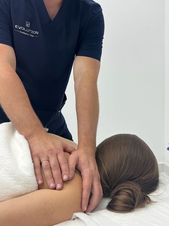 Taping is a therapeutic method that uses elastic cotton strips to gently lift the skin and support muscles and fascia. It helps reduce swelling, improve circulation and lymph flow, and give your body clear posture cues. We use it on the face and body to calm puffiness, ease jaw or neck tension, or support overworked areas after training or procedures. The tape feels light, moves with you, and can be worn under clothes for several days. Your practitioner will cut and place each strip for your goal and skin type. It’s a simple add-on that can speed recovery and make daily movement more comfortable.