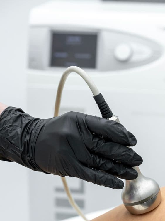 Gentle acoustic waves work through the skin without needles; the procedure feels like a warm, gliding massage.